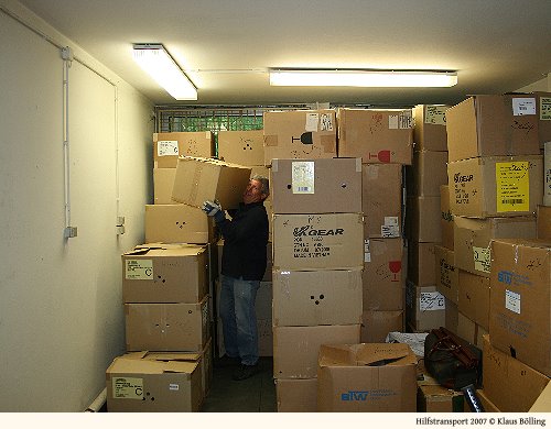 Mehrere hundert Kartons sind gepackt worden und stehen nun zum Verladen auf den LKW bereit. Gebrauchte Kleidung ist vor dem Transport sorgfältig kontrolliert, sortiert und verpackt worden.